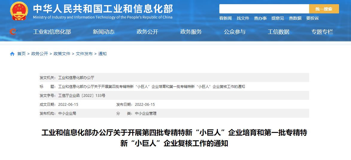 日前,工业和信息化部办公厅发布关于开展第四批专精特新“小巨人”企业培育和第一批专精特新“小巨人”企业复核工作的通知。