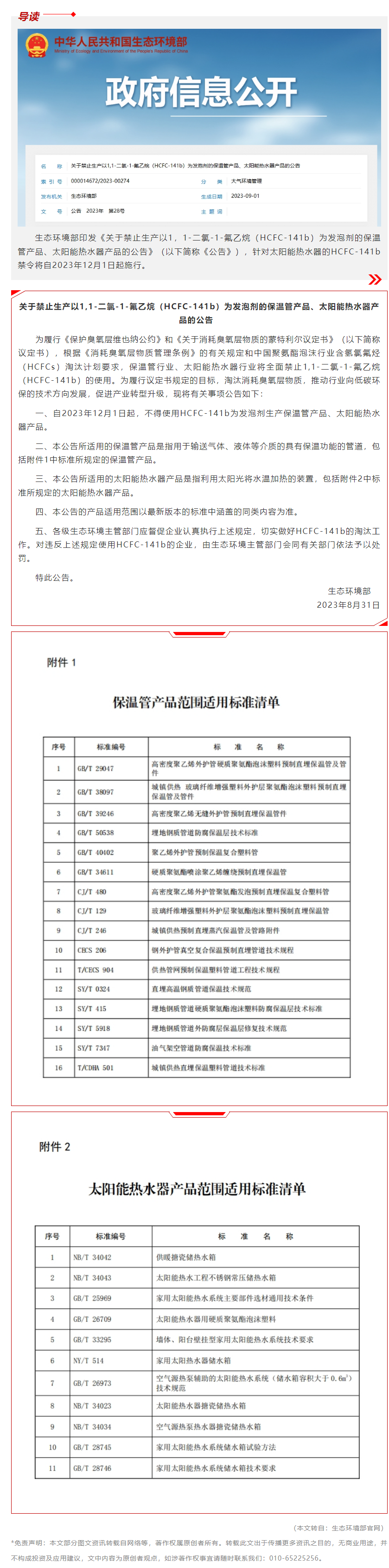 政策速递 | 《关于禁止生产以1,1-二氯-1-氟乙烷(HCFC-141b)为发泡剂的保温管产品、太阳能热水器产品的公告》