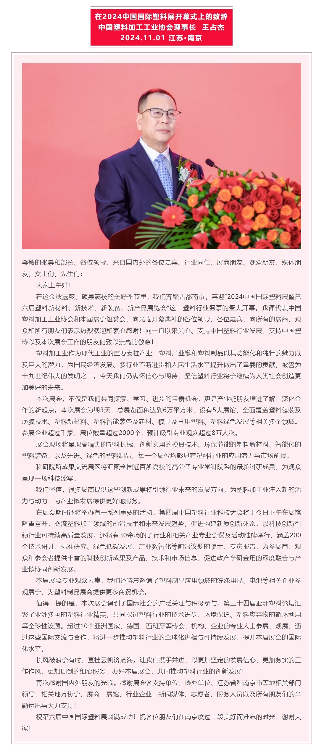 王占杰理事长在2024中国国际塑料展开幕式上的致辞